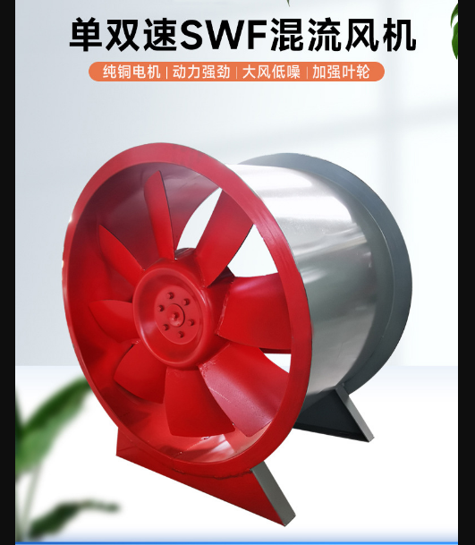混流(斜流)風機,風壓系數比軸流風機高,流量系數比離心風機大,用在風壓和流量都“不大不小”的場合。它填補了軸流風機和離心風機之間的空白。同時具備安裝簡單方便的特點。