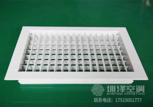 雙層百葉風口由雙層葉片組成,前面一層葉片是可調的,后面一層葉片是固定的,根據需要可配置對開式多葉風量調節閥,用來調節風口風量。凡前面葉片為豎向布置、后面葉片為橫向布置的稱為VH式。通過改變豎葉片的安裝角度,可調整氣流的擴散角。例如,設在賓館客房小過道內的臥式暗裝風機盤管機組的出風口,通常是采用VH式雙層百葉風口的。